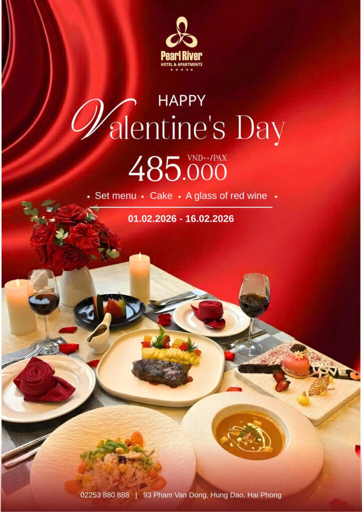 On this special occasion, Pearl Café – Pearl River Hotel & Apartments is pleased to present a Special Valentine Set Menu exclusively designed for couples, priced at VND 550,000 net per guest. The set includes a beautifully decorated dessert for couples and one glass of red wine or Tropical Twist mocktail per guest, offering a complete and delightful dining experience.